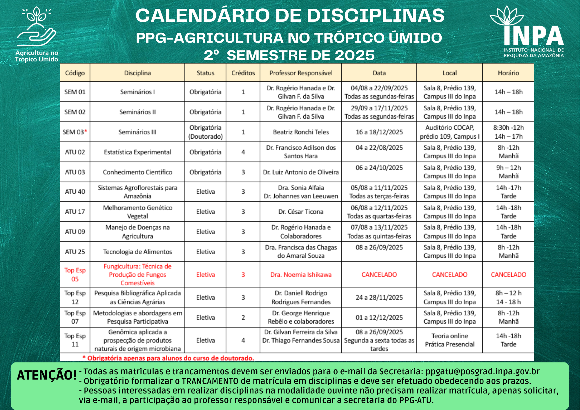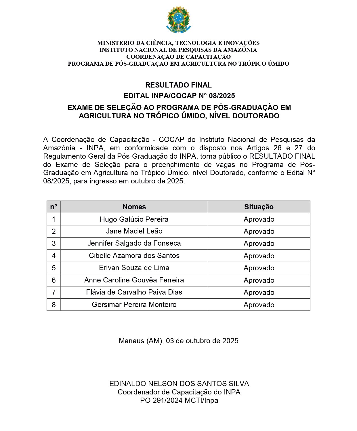 De ordem da Comissão de Eleição do PPG-ATU, divulgamos o Resultado Final com os seis nomes mais votados, indicados para compor a lista sêxtupla a ser encaminhada ao Diretor do Instituto Nacional de Pesquisas da Amazônia (Inpa).