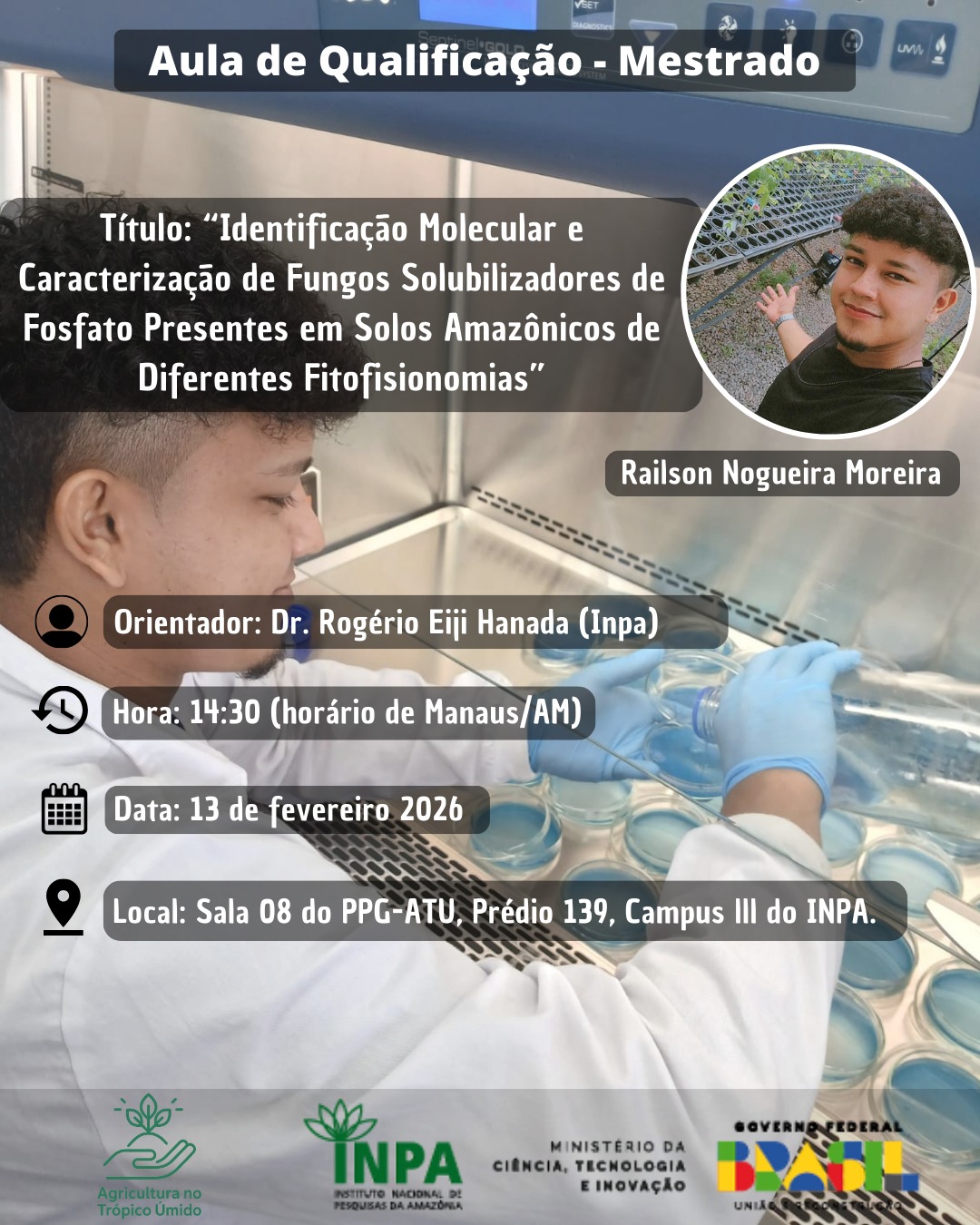 O evento será no dia 13/02/2026, às 14:30h (horário de Manaus/AM), Sala 08 do PPG-ATU, Prédio 139, campus III do INPA.