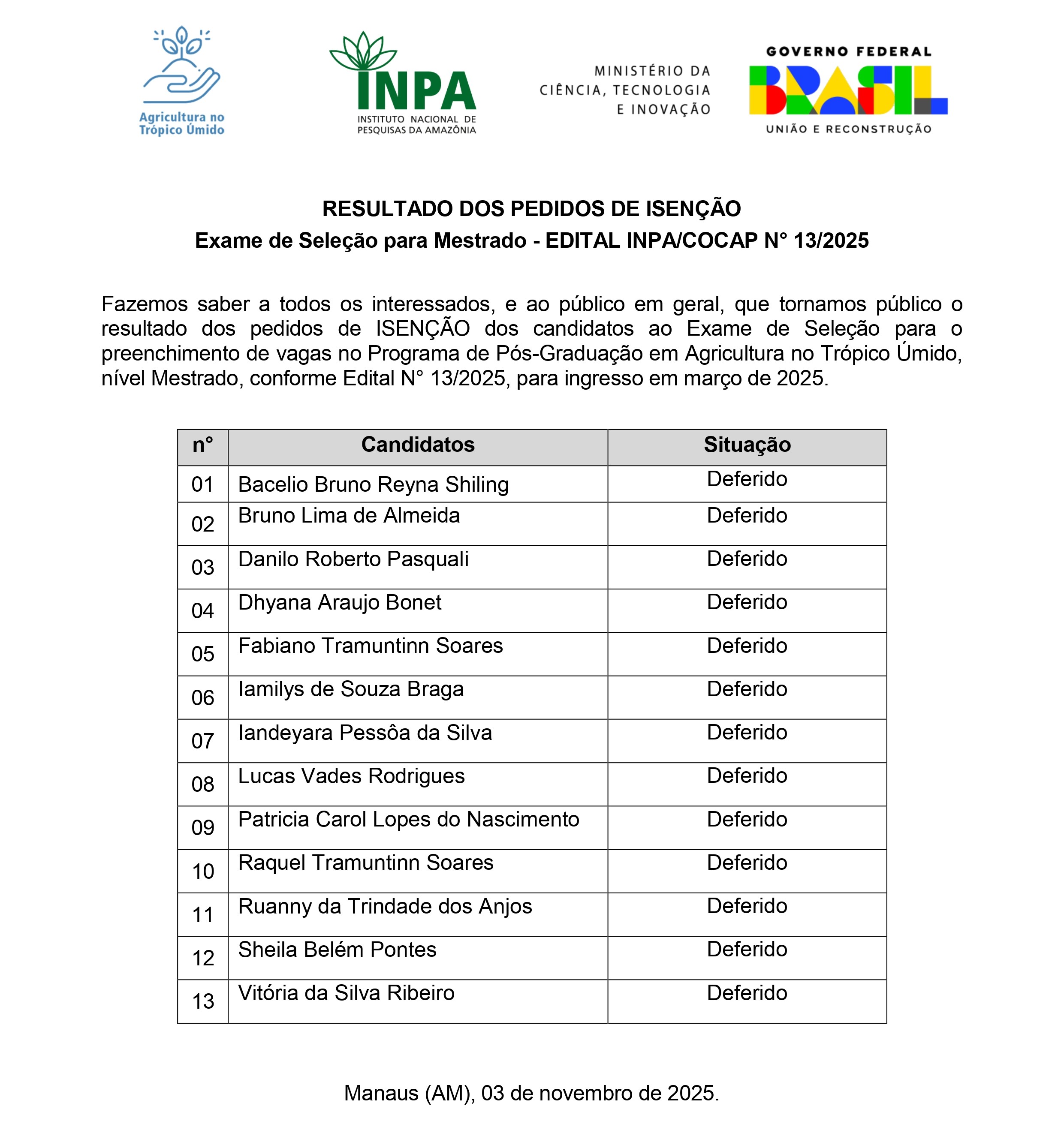 Resultado dos Pedidos de ISENÇÃO (NÍVEL MESTRADO) - Edital INPA/COCAP N° 13/2025 - PPG/ATU_Inpa