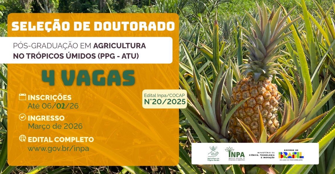 Está aberto o edital de seleção para o curso de Doutorado do Programa de Pós-Graduação em Agricultura no Trópico Úmido (PPG-ATU) do Instituto Nacional de Pesquisas da Amazônia (Inpa/MCTI). O processo seletivo oferece 04 (quatro) vagas de ampla concorrência, para início no primeiro semestre de 2026. As inscrições acontecem de 22 de dezembro a 06 de fevereiro de 2026, pelo site oficial do ATU.