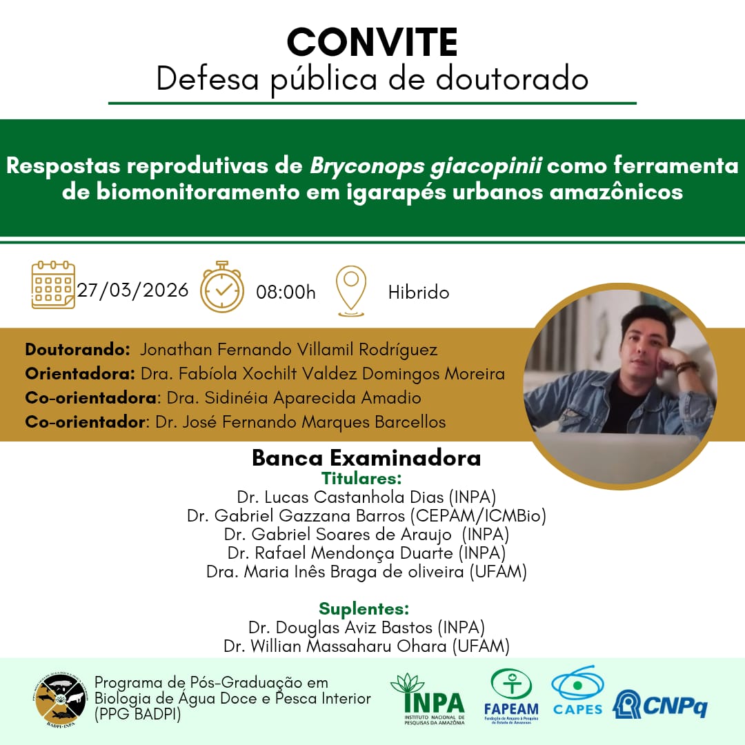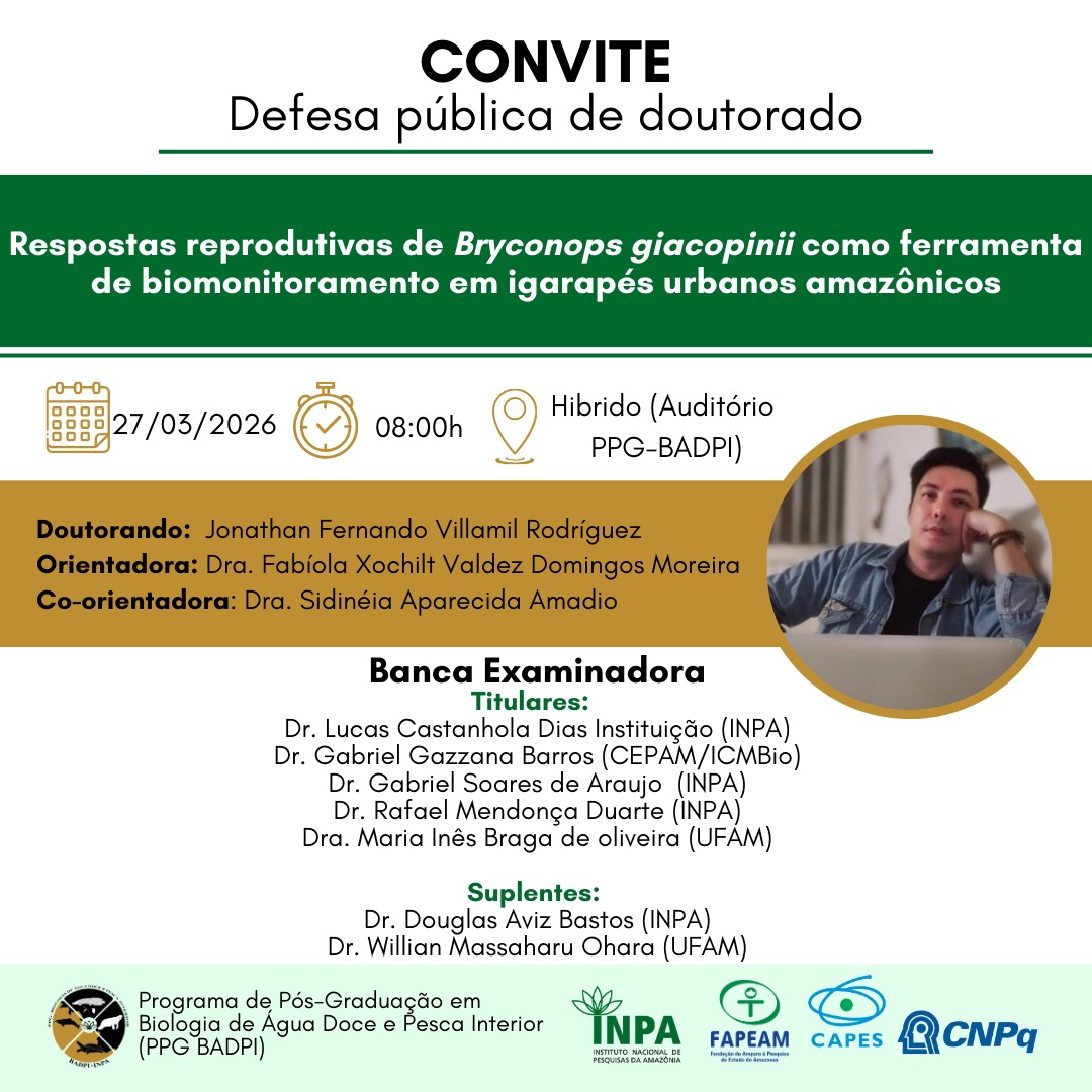 Título: Fechando o círculo: aproveitamento da biomassa de microalga produzida a partir do efluente da piscicultura como ingrediente para ração de peixes Nível: Doutorado Autor: Renan Gomes Nascimento (doutorado) Data: 28/04/2026 14:00h Local: Remoto (Link será enviado posteriormente)