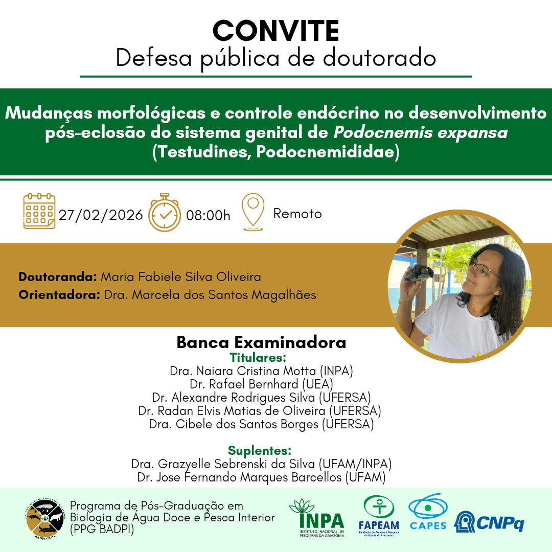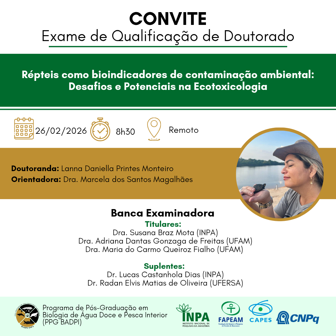 Título: Répteis como bioindicadores de contaminação ambiental: Desafios e Potenciais na EcotoxicologiaNível: DoutoradoAutor: Lanna Daniella Printes MonteiroData: 26/02/2026 8:30hLocal: Remoto (Link: https://meet.google.com/snm-jbgv-kiw) (Horário Manaus)