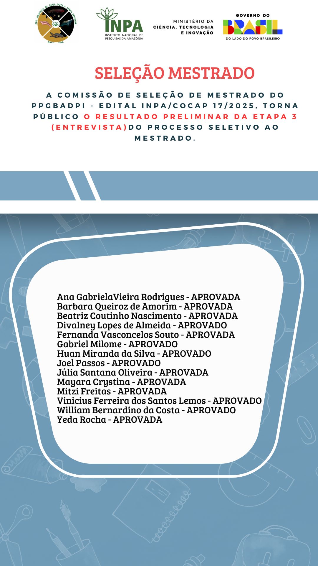 SELEÇÃO MESTRADO: Edital INPA/COCAP 17-2025- Preliminar Etapa 3