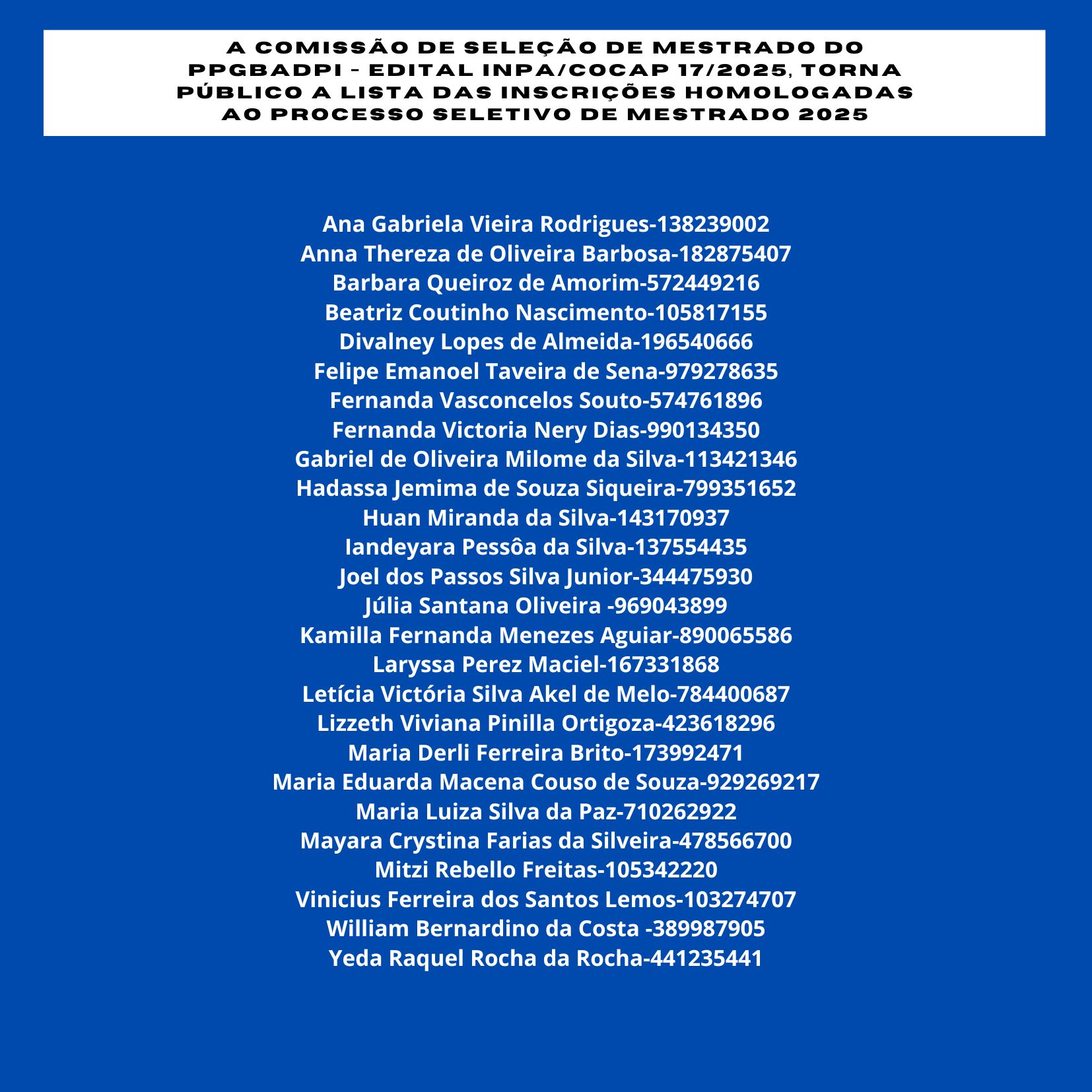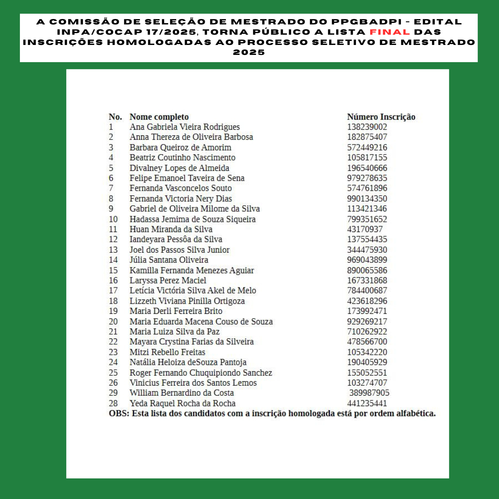 SELEÇÃO MESTRADO BADPI: Lista FINAL das Inscrições Homologadas Edital 17/2025