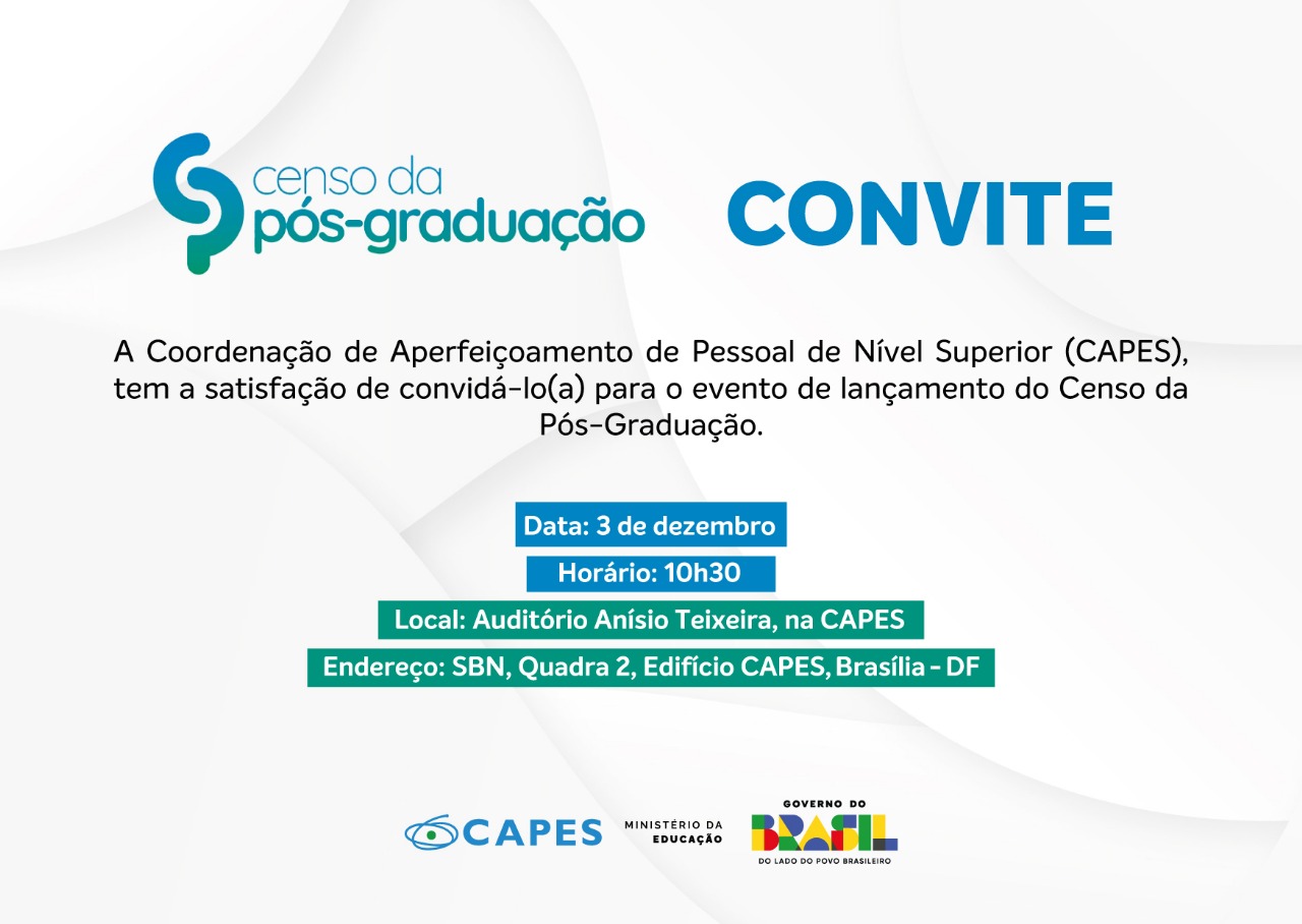 A Coordenação de Aperfeiçoamento de Pessoal de Nível Superior (CAPES) convida a comunidade acadêmica para o evento oficial de lançamento do Censo da Pós-Graduação.