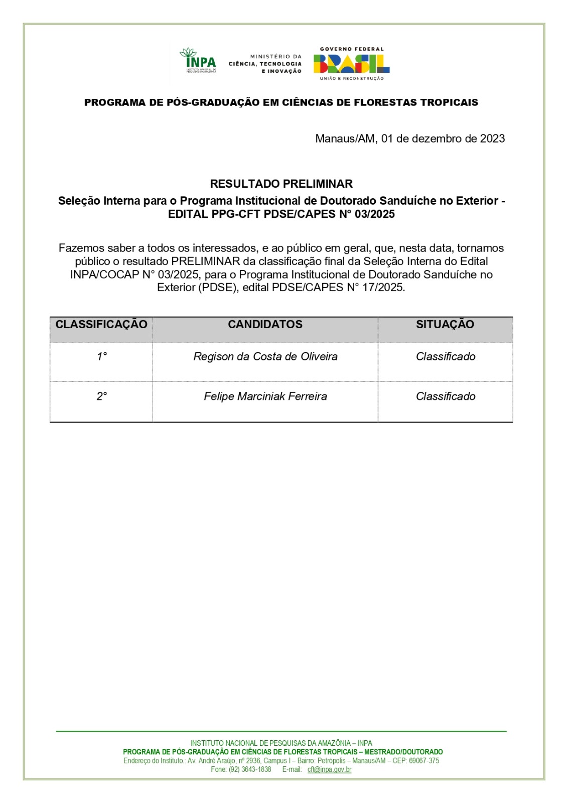 A avaliação do Programa de Pós-Graduação em Ciências de Florestas Tropicais (PPG CFT/INPA) foi homologada pelo Conselho Técnico-Científico da Educação Superior (CTC-ES) da CAPES.