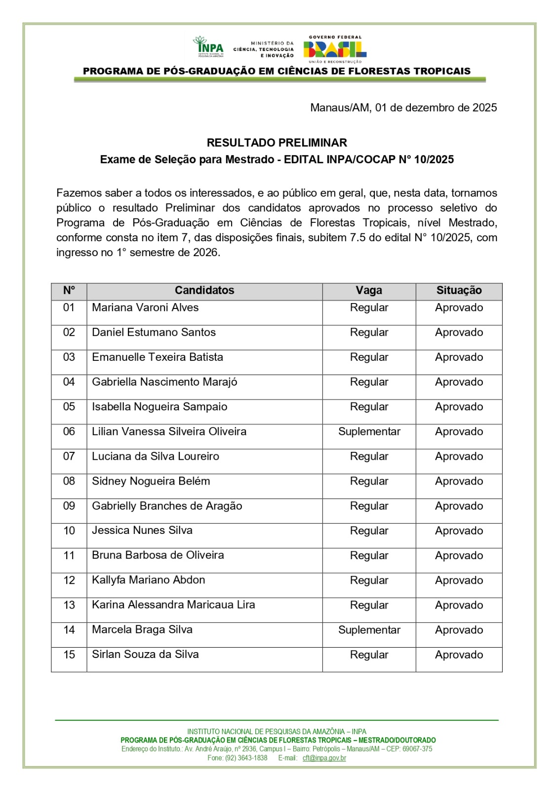 Resultado Preliminar - Processo seletivo de mestrado - Edital 10/2025