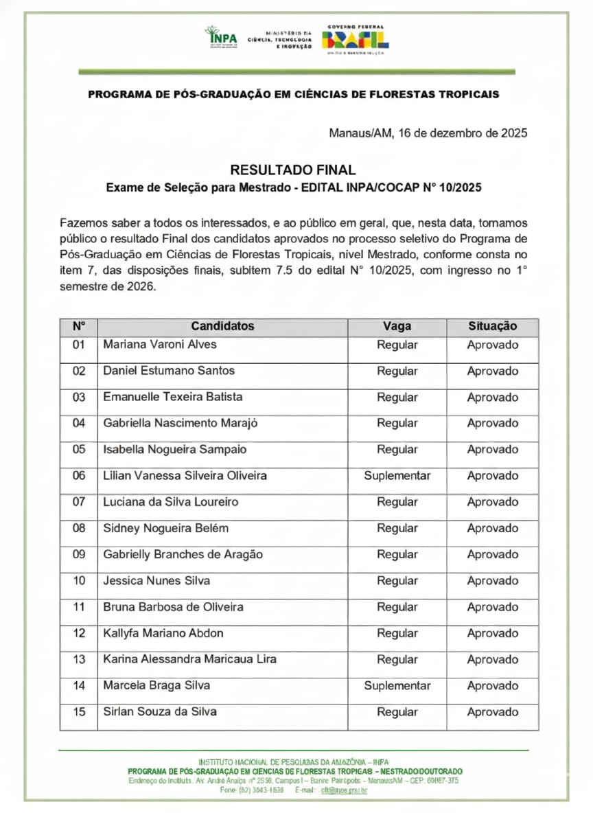 Resultado Final - Processo seletivo de mestrado - Edital N° 10/2025