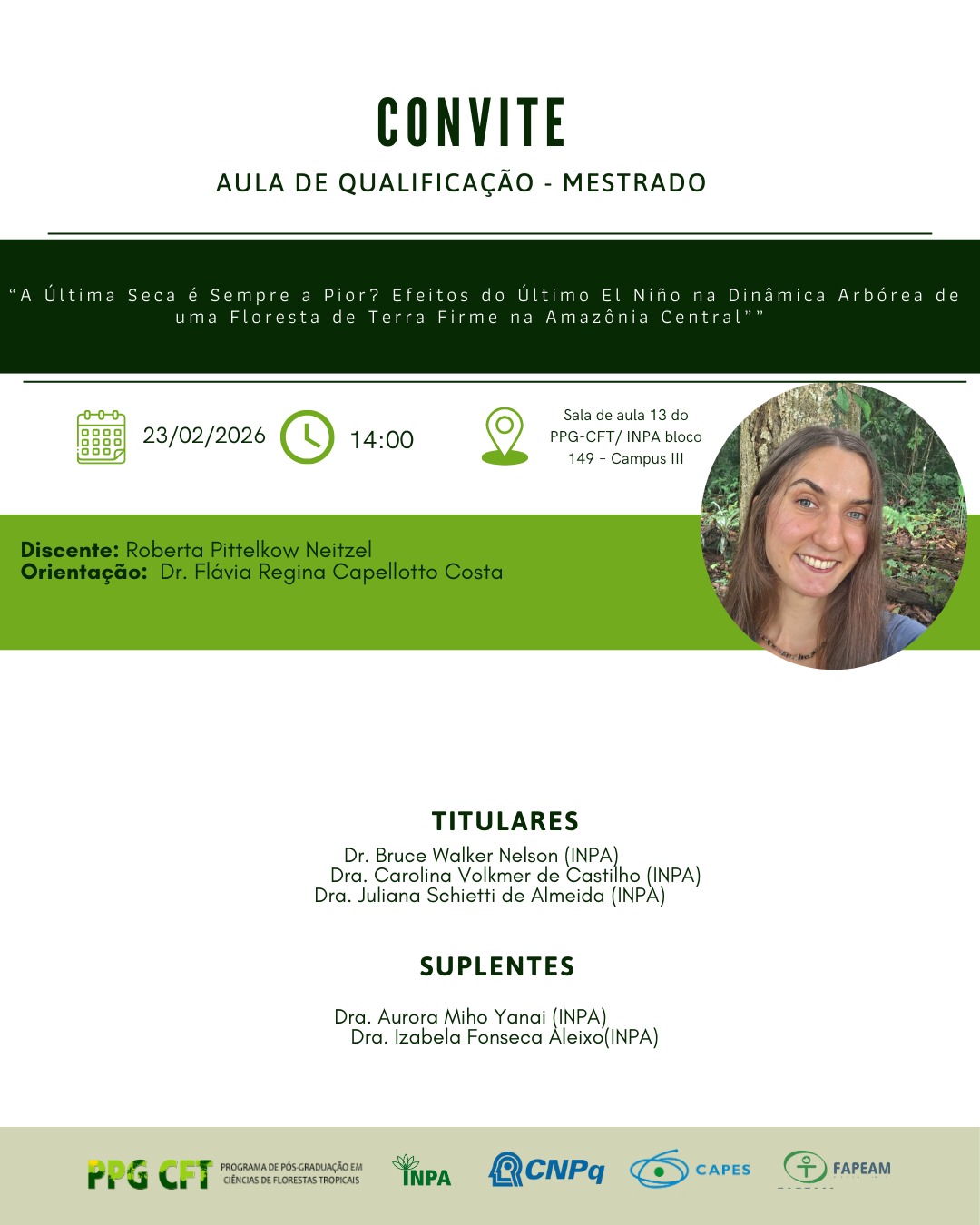 Às 14:00h (horário de Manaus/AM), Local: Sala de Aula 13, PPG Ecologia – Bloco 139, INPA Campus III