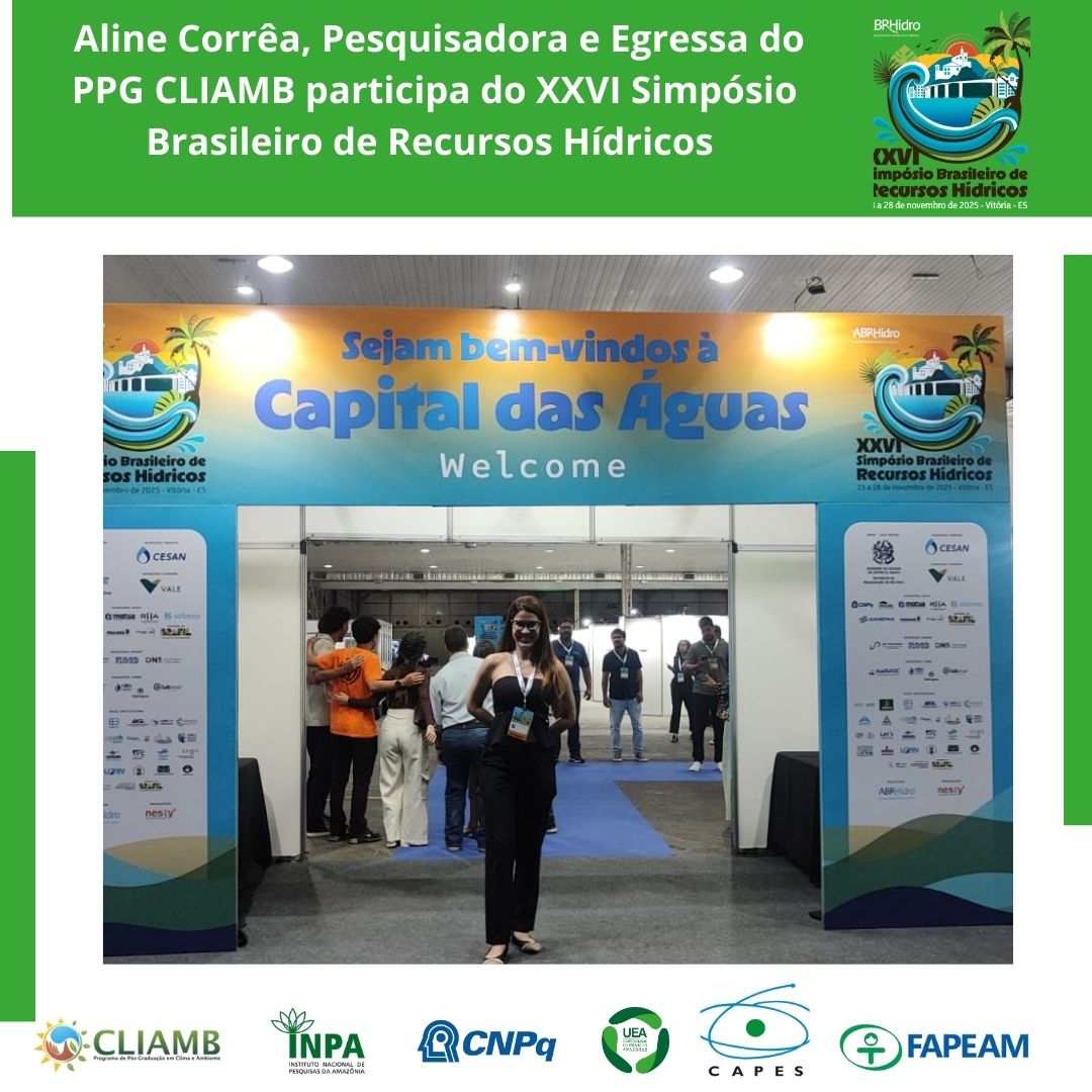 A pesquisadora Aline Corrêa de Sousa, colaboradora e egressa do PPG-CLIAMB, participou do XXVI Simpósio Brasileiro de Recursos Hídricos (SBRH 2025), realizado de 23 a 28 de novembro de 2025, em Vitória (ES), representando o PPG-CLIAMB/INPA–UEA.