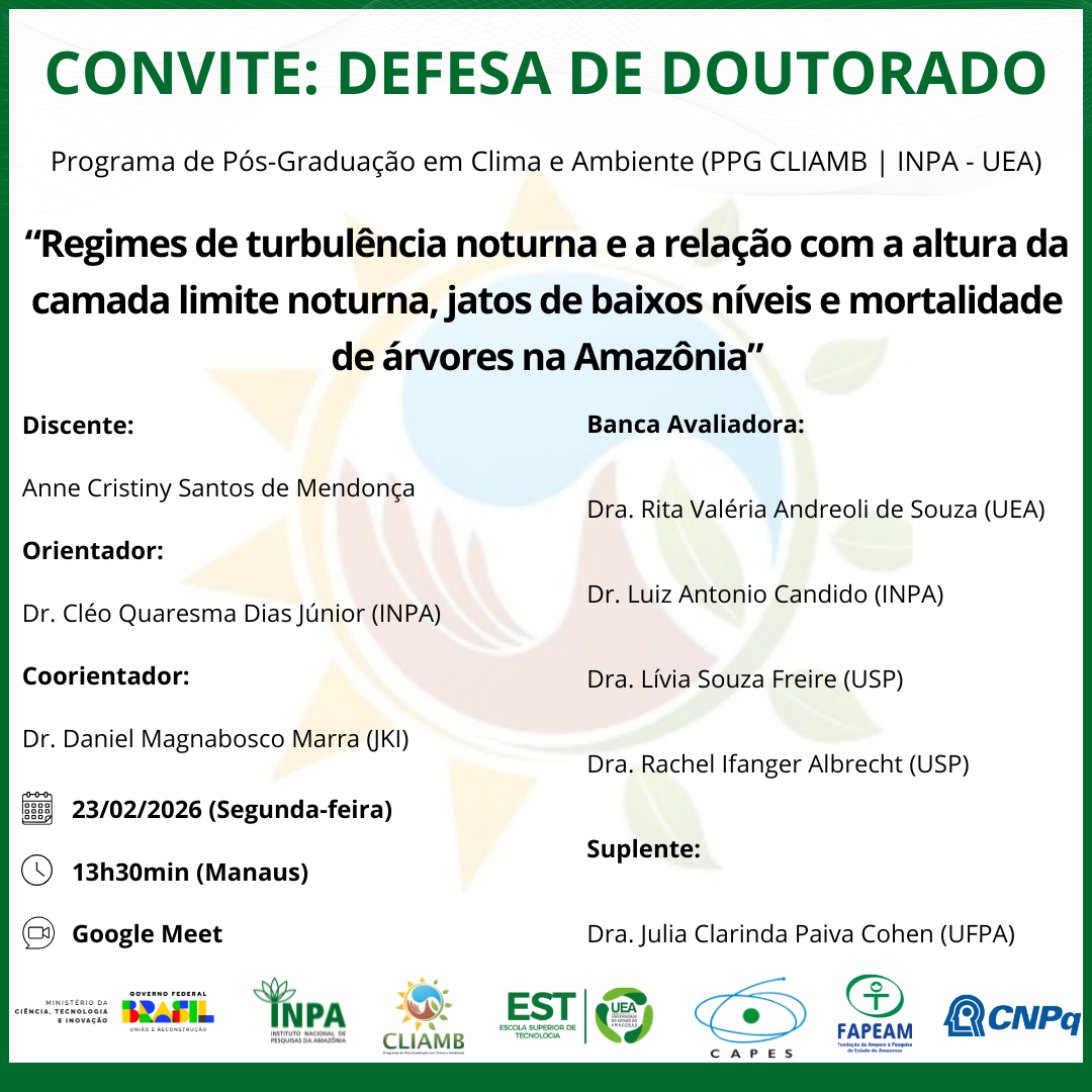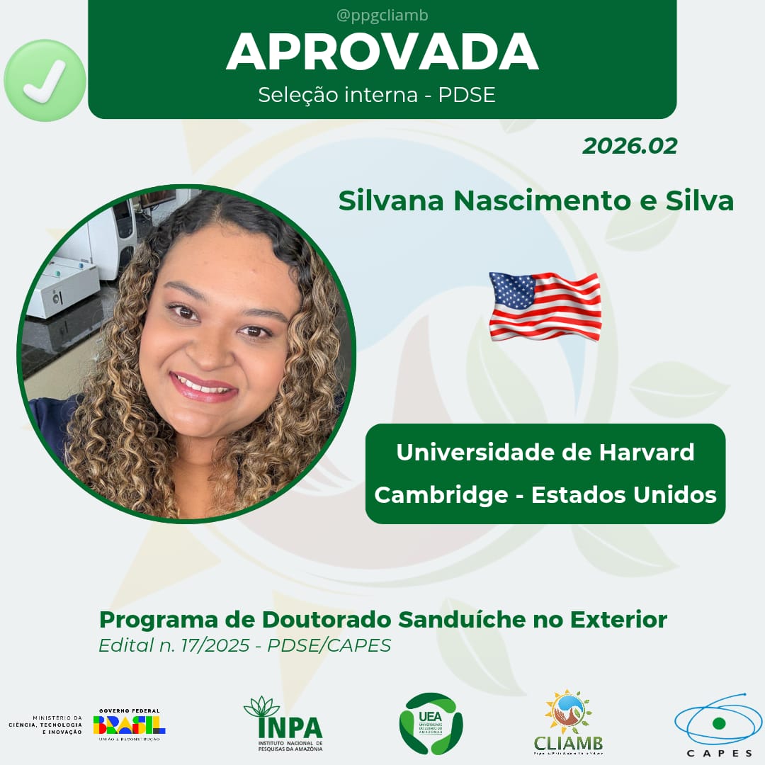 A discente de doutorado Silvana Nascimento e Silva, do Programa de Pós-Graduação em Clima e Ambiente (PPG-CLIAMB | INPA–UEA), foi aprovada na seleção interna para o Programa Institucional de Doutorado Sanduíche no Exterior (PDSE – CAPES), conforme o Resultado da Segunda Chamada do Edital nº 17/2025.