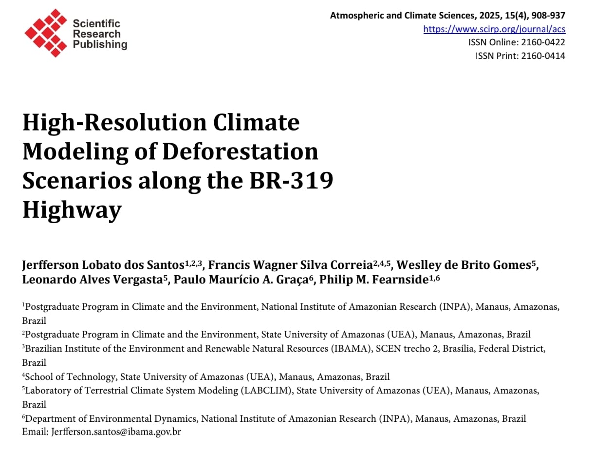 O egresso do PPG-Cliamb (INPA/UEA) em parceria com pesquisadores do Laboratório de Modelagem do Sistema Climático Terrestre (LABCLIM) e demais instituições, Jerfferson Lobato dos Santos, publicou um importante estudo na revista Open Journal of Modern Hydrology (SCIRP)!