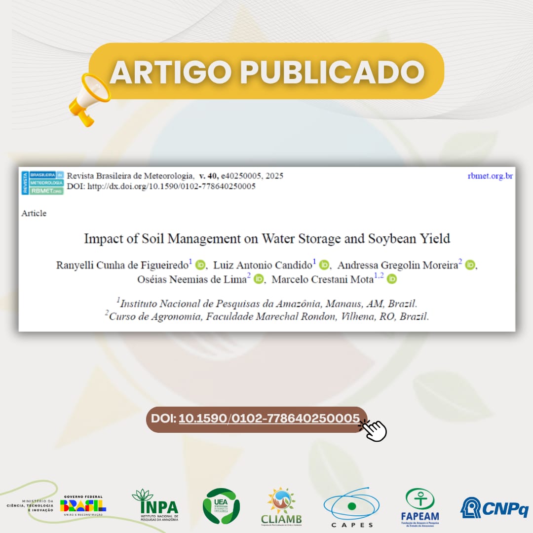 A doutoranda do PPG-CliAmb, Ranyelli Figueiredo, junto com demais pesquisadores, publicaram um estudo na Revista Brasileira de Meteorologia com o título “Impact of Soil Management on Water Storage and Soybean Yield under Changing Precipitation Patterns” (Impacto do manejo do solo no armazenamento de água e rendimento da soja frente a mudanças pluviométricas).