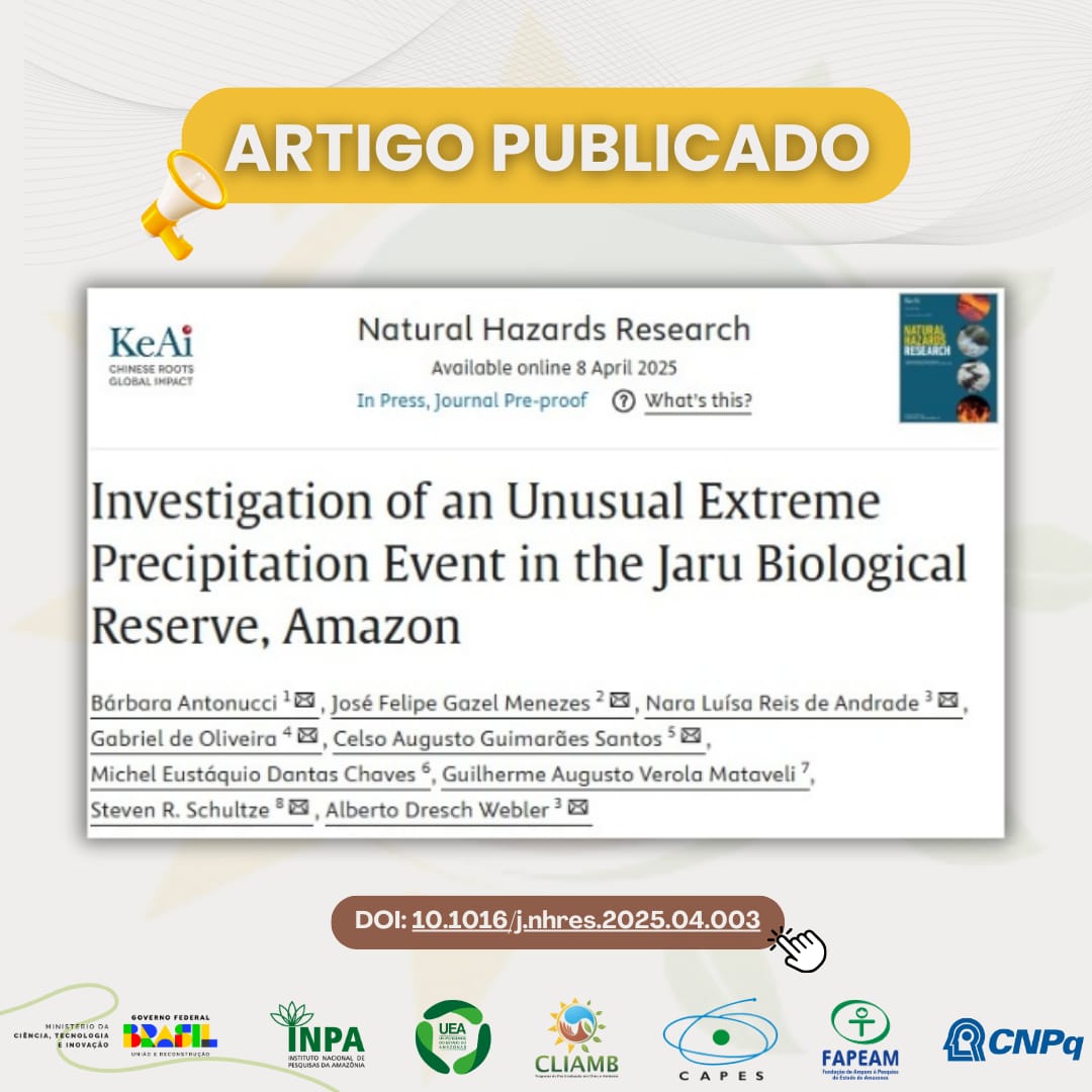 A doutoranda Bárbara Antonucci, do PPGCLIAMB (INPA/UEA), em coautoria com pesquisadores nacionais e internacionais, publicou o artigo “Investigation of an Unusual Extreme Precipitation Event in the Jaru Biological Reserve, Amazon” na revista Natural Hazards Research (Elsevier).