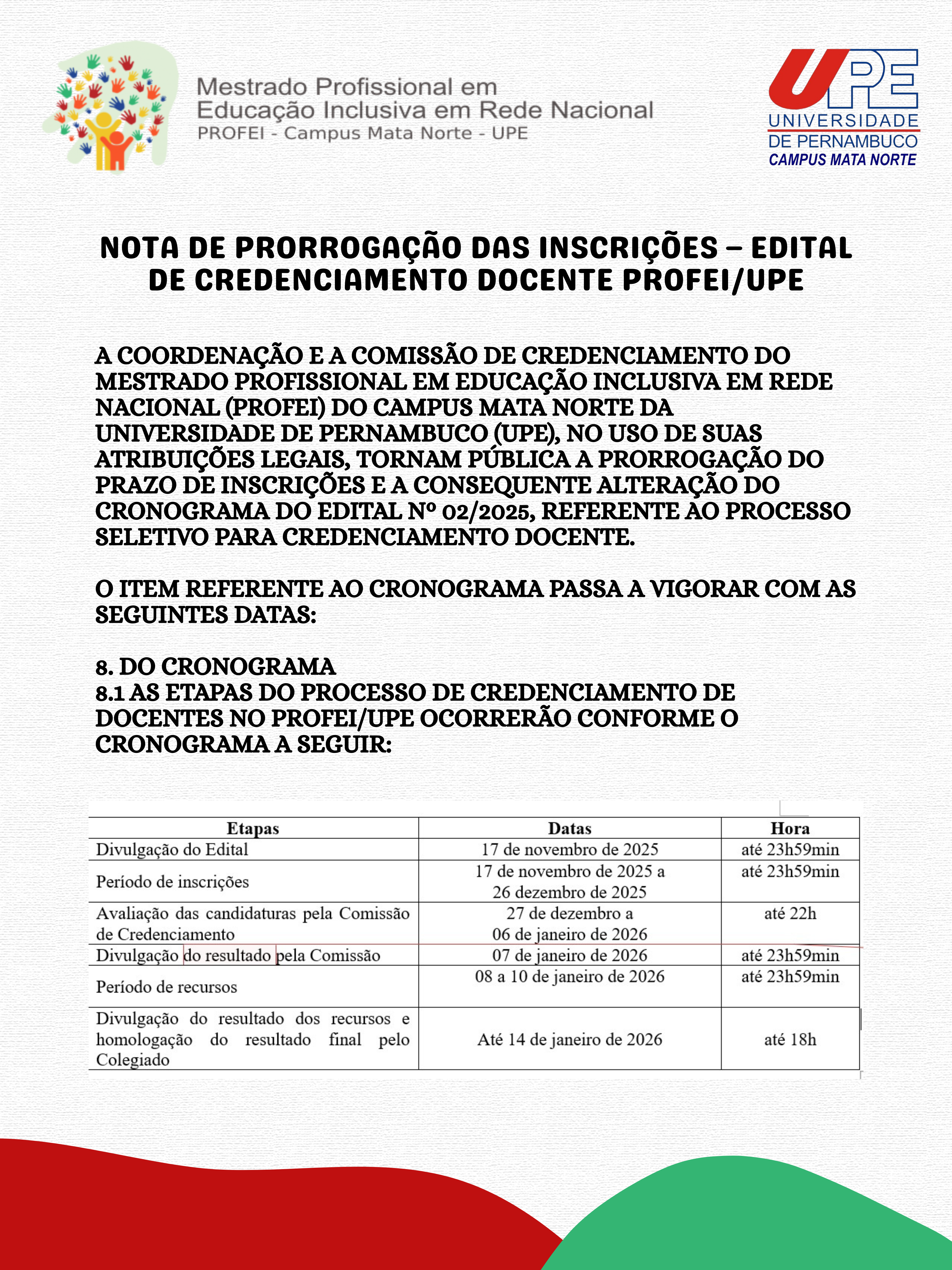 NOTA DE PRORROGAÇÃO DAS INSCRIÇÕES – edital de Credenciamento Docente PROFEI/UPE