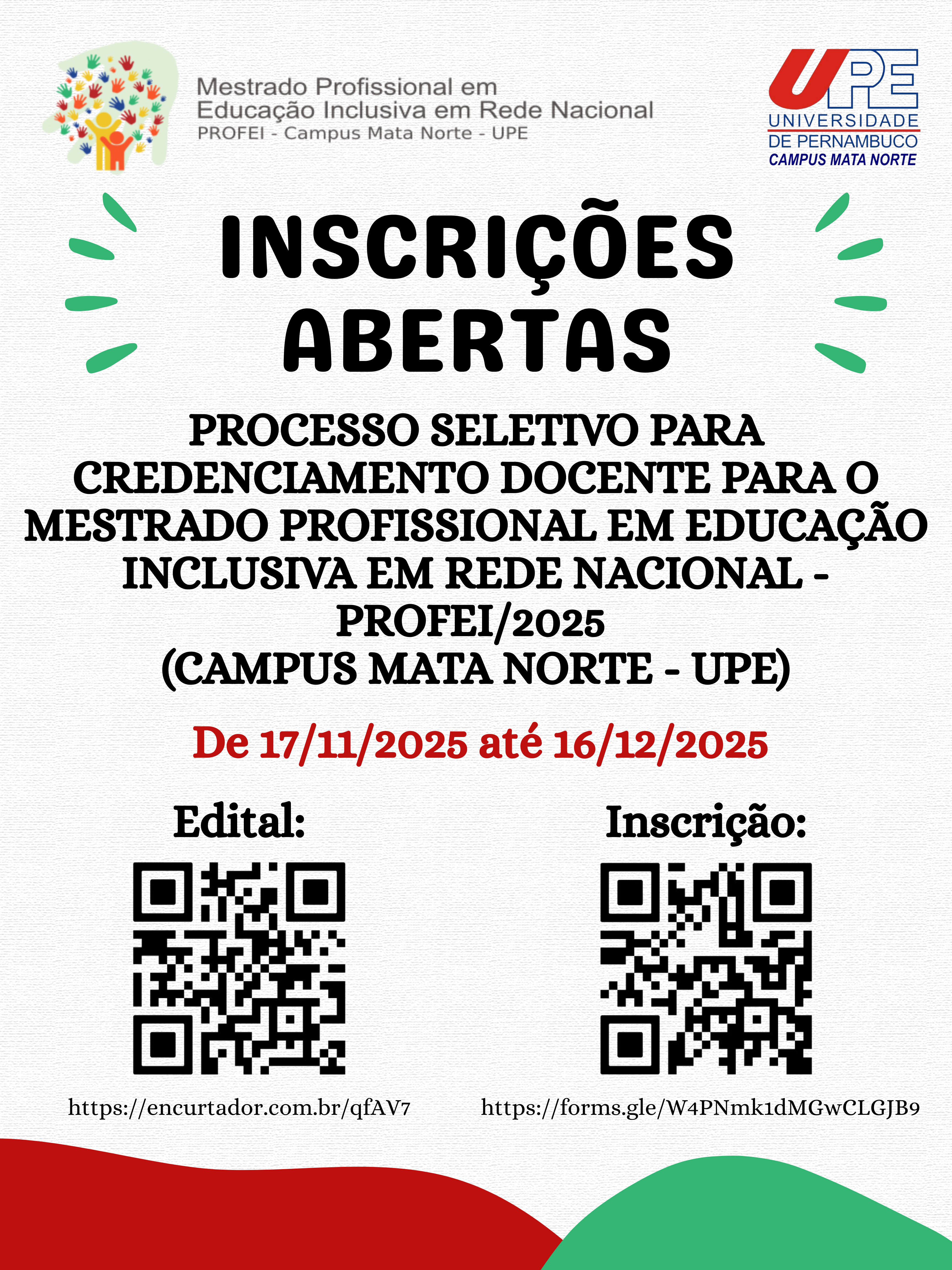 A Universidade de Pernambuco (UPE), Campus Mata Norte, anuncia a abertura do processo seletivo para credenciamento de docentes no Mestrado Profissional em Educação Inclusiva em Rede Nacional (PROFEI). Com sete vagas disponíveis para docentes permanentes, o credenciamento visa ampliar a qualidade da formação oportunizada pelo mestrado em rede para professores da Educação Básica. As inscrições serão realizadas de 17 de novembro a 16 de dezembro de 2025.