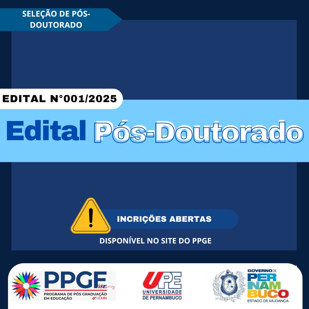 O Programa de Pós-Graduação Stricto Sensu em Educação (PPGE), Mestrado e Doutorado Profissional em Educação, da Universidade de Pernambuco, Campus Mata Norte, comunica a todos/as os/as interessados/as que se encontra aberto o Edital Pós-Doutorado.