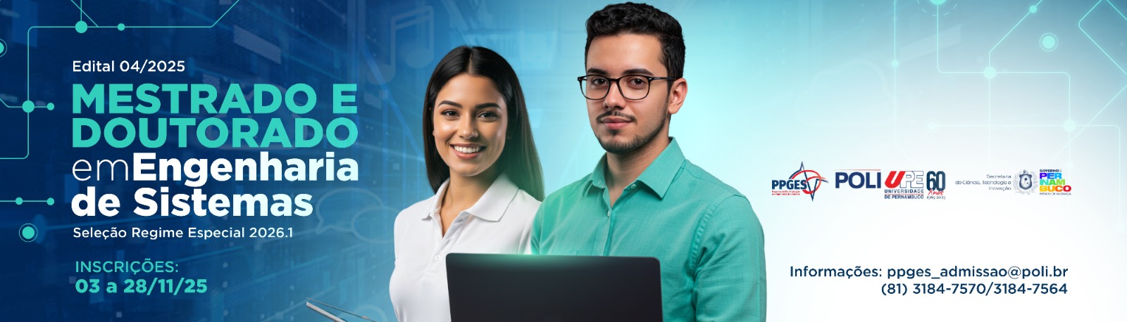 A Coordenação do Programa de Pós-Graduação em Engenharia de Sistemas da Universidade de Pernambuco torna pública a abertura do EDITAL 04/2025 - REGIME ESPECIAL - MESTRADO E DOUTORADO EM ENGENHARIA DE SISTEMAS DA POLI/UPE.